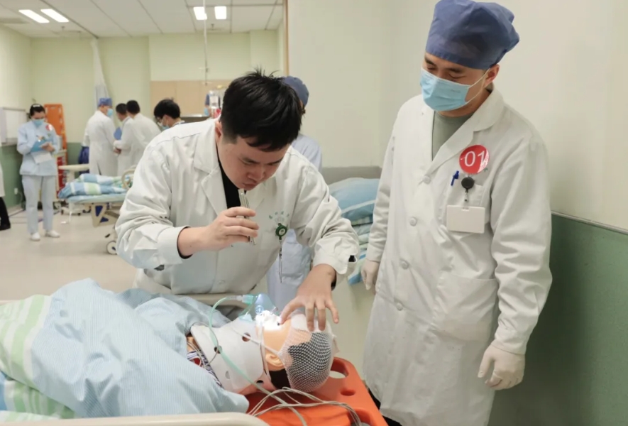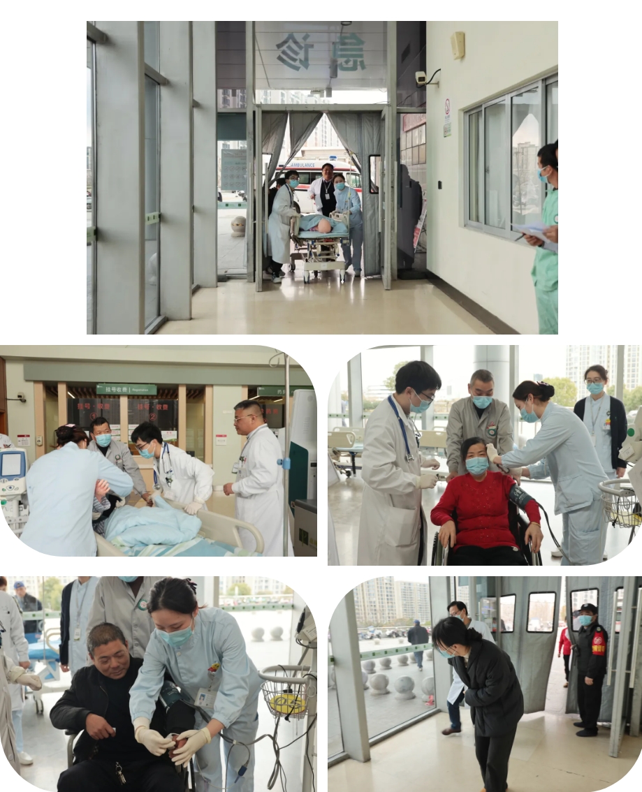 科学分诊 精准救治14:15起,伤员分批次送达。预检分诊组快速评估伤情,依据“红-黄-绿”分区原则对伤员进行编号、分类和分流。2名危重患者(疑似颅内出血、腹腔出血)被迅速送入红区,启动最高优先级抢救;3名中度伤员进入黄区(抢救室);5名轻伤员则在绿区(临时诊疗区)有序接受处置。整个过程忙而不乱,通道畅通。