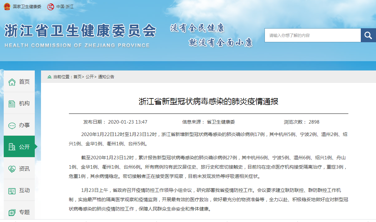 截至2020年1月23日12时,我省累计报告新型冠状病毒感染的肺炎病例27例。其中宁波大市确诊5例。
