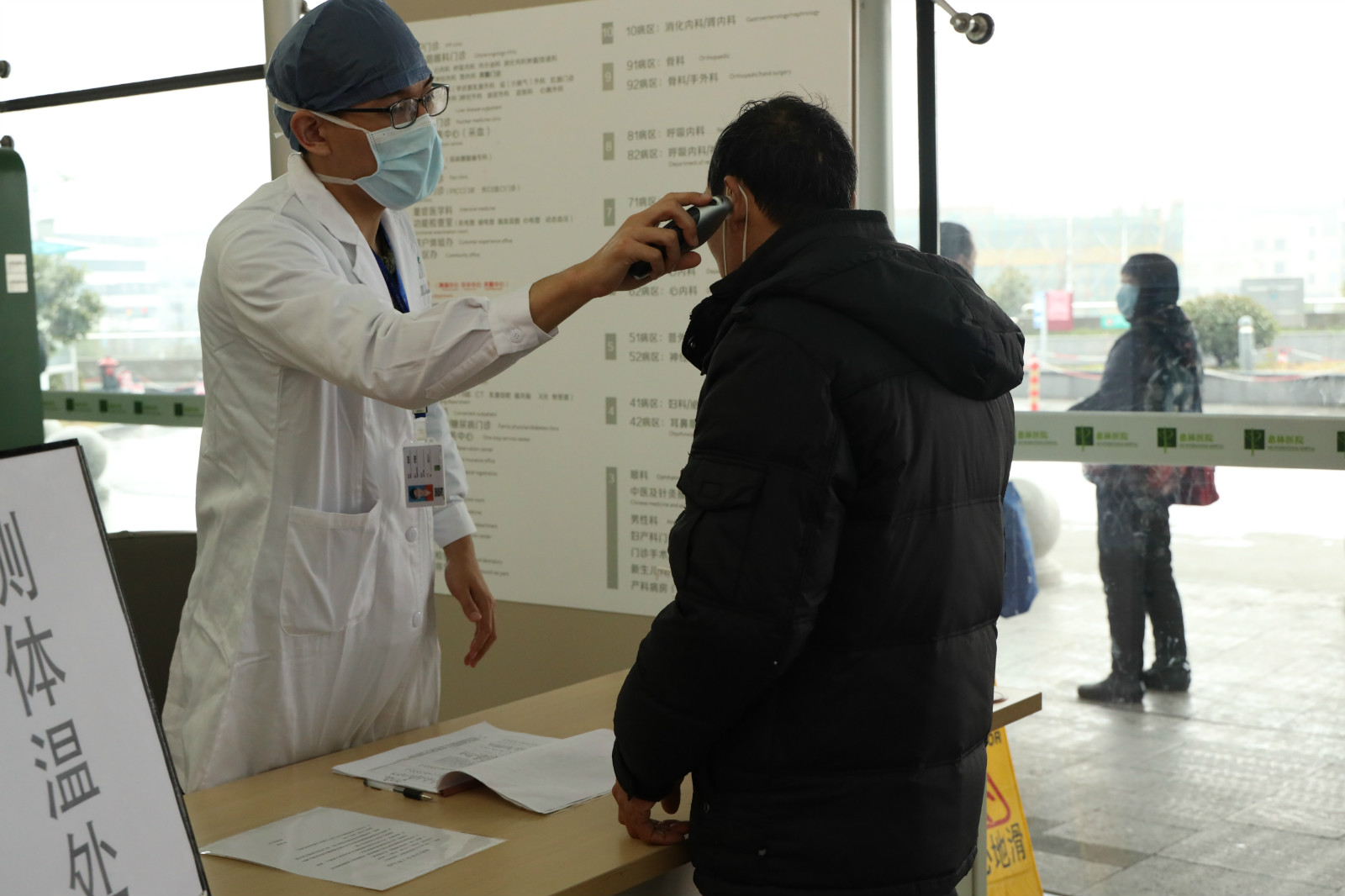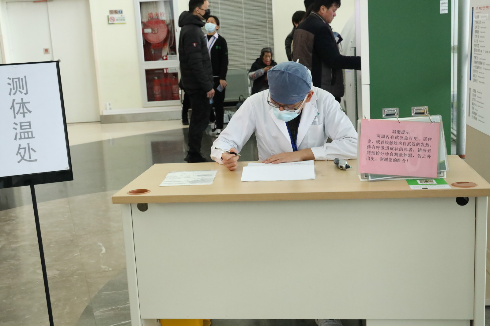 门诊大厅设立的体温测量点,专业人员会详细登记每一位发热病人基本信息。尤其重点排查是否有两周内有武汉居住史、旅行史,或曾经接触过来自武汉的发热,伴有呼吸道症状的患者。